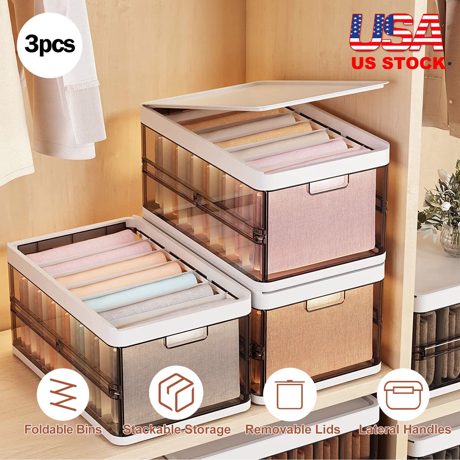3 Packs Collapsible Storage Bins Wardrobe Closet Organizer Container With Lid