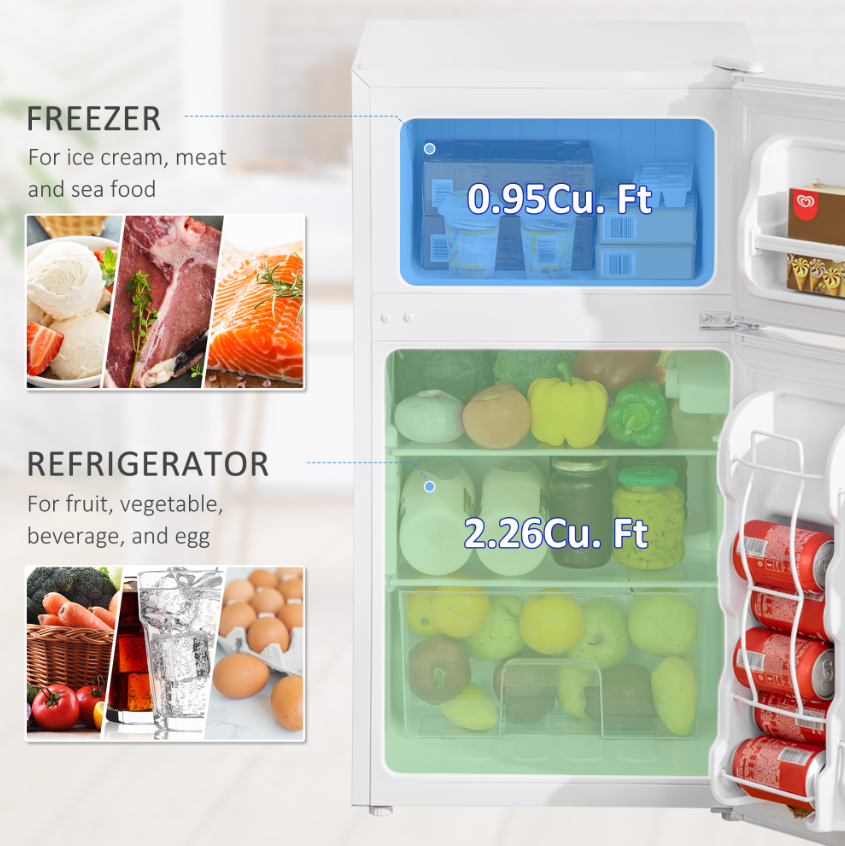 - Capacity: 2.26 Cu.Ft (Refrigerator), 0.95 Cu.Ft (freezer), 3.2 Cu.Ft (total)