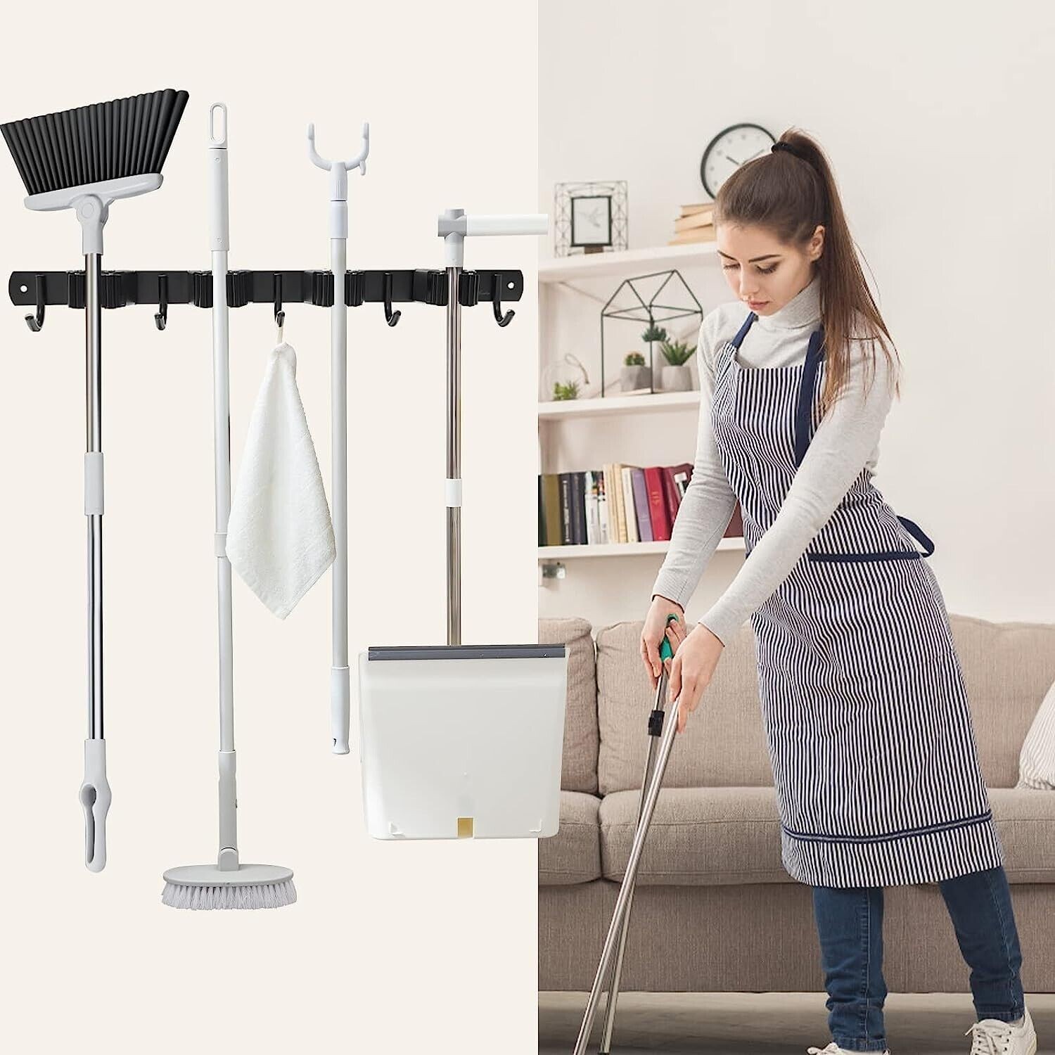 Broom Holder Wall Mount 4 Racks and 5 Hooks Broom Organizer Stora