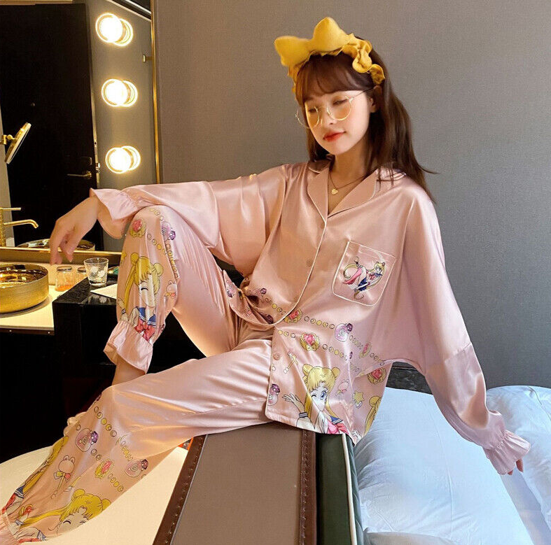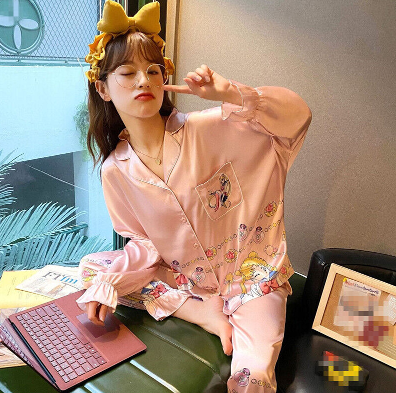 Sailor Moon Ice Silk Pajamas Set Women Cartoon V-neck Long Sleeve Sleepwear Pink