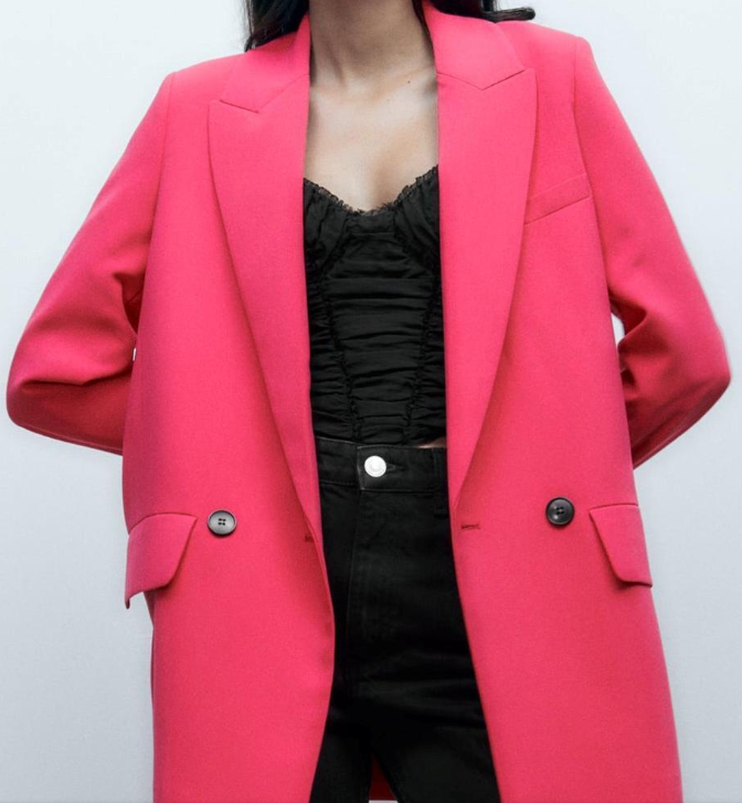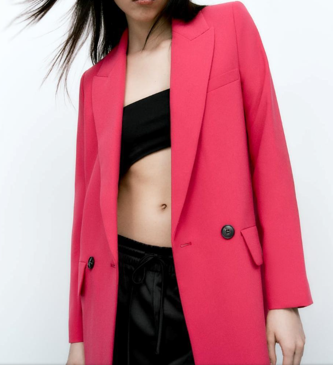 This long loose fit blazer from Zara is made from 100% polyester with matching lining, ensuring the most comfort fit. Featuring a lapel collar, back vent at hem, long sleeves with shoulder pads and front button fastening. The shoulder pads give off a more structured look and front flap pockets provides practicality to the smart blazer making it perfect for everyday wear. The colour and structure of this blazer leave it versatile enough to wear for any occasion.
